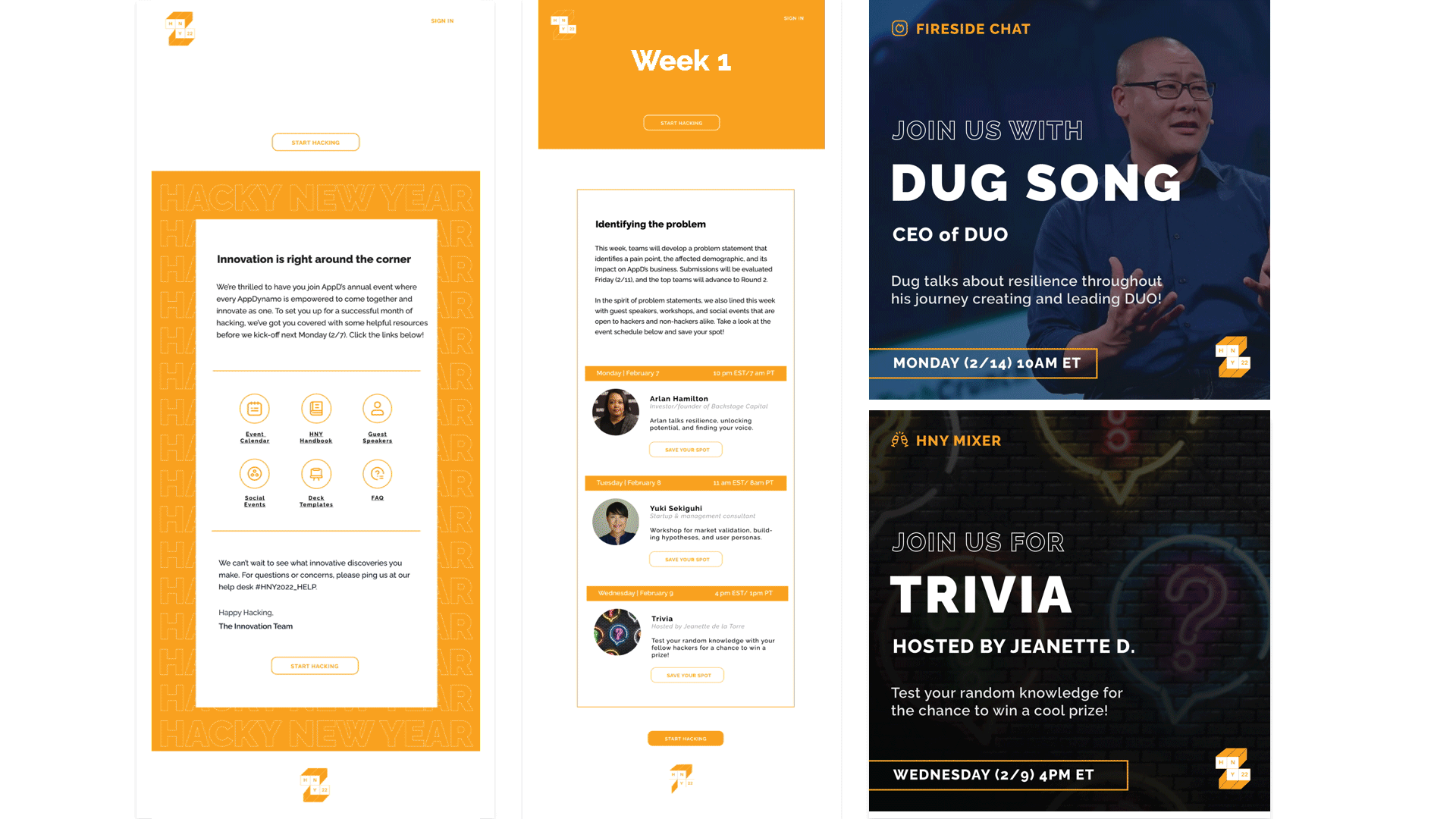 Objective: 2021 marked AppDynamics’ 4th annual hackathon, Hacky New Year. For the first time, our team had to design a large-scale, all-virtual Hackathon event while many employees were feeling plagued by uncertainty, exhausted from a new work-life dynamic, and emotionally fatigued from a snowball of turbulent events. Our solution was to create a virtual experience built on these core themes: more seats at the table, resilience, and empowerment. We carried this new approach into future hackathons in order to create an energizing and immersive experience for hackers while embedding our themes into every corner of the event.